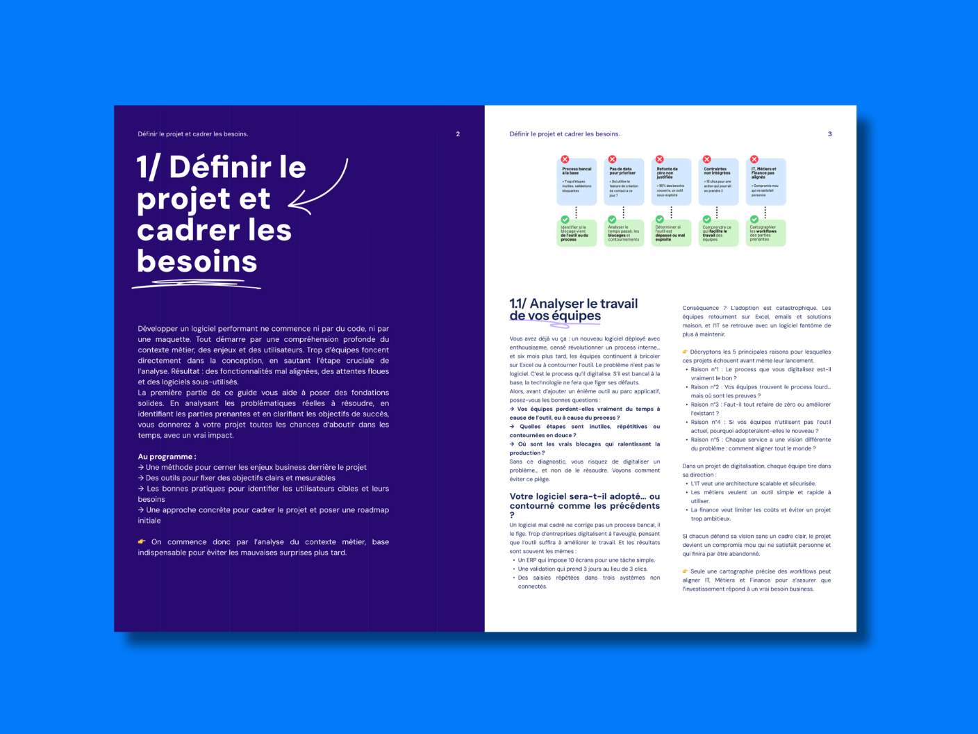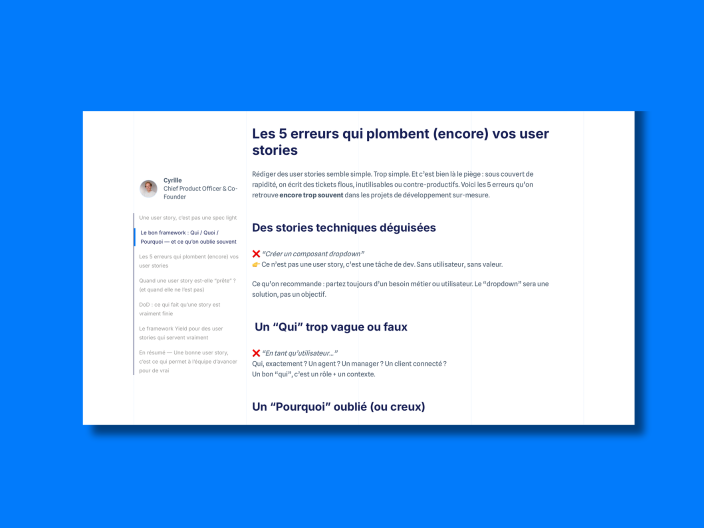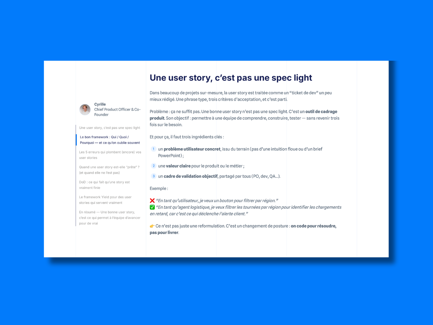 On a construit une série d’articles autour d’un même fil : réussir un projet de développement logiciel – du cadrage produit à la mise en prod. Roadmap, architecture, delivery, clean code : chaque article répond à une problématique concrète, avec une exigence simple : parler cash, terrain, actionnable.